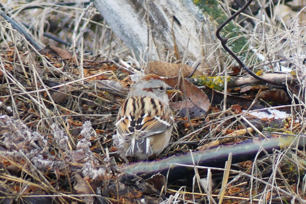 When American Tree Sparrows find seeds on bare ground, they often scratch up the debris with two feet, resembling the behavior of Towhees.