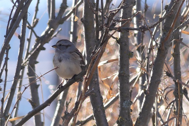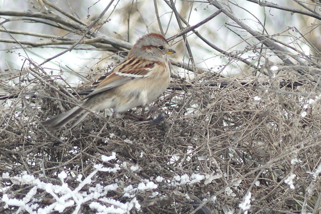 American Tree Sparrows breed in the tundra of the far north and migrate to southern Canada and US in winter. Here in the West Valley I see small flocks in fields and weedy roadsides where they harvest seeds. They take cover in dense evergreen trees and hedgerows.